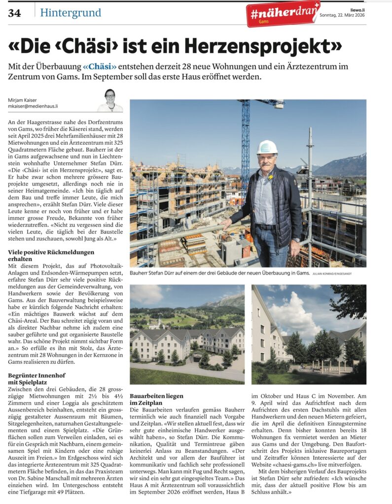 In einem aktuellen Zeitungsartikel spricht Bauherr Stefan Dürr über die Entstehung und Bedeutung der Überbauung Chäsi Gams. Für ihn ist das Projekt weit mehr als ein Bauvorhaben – es ist ein persönliches Anliegen, das die Entwicklung des Dorfzentrums nachhaltig prägt.